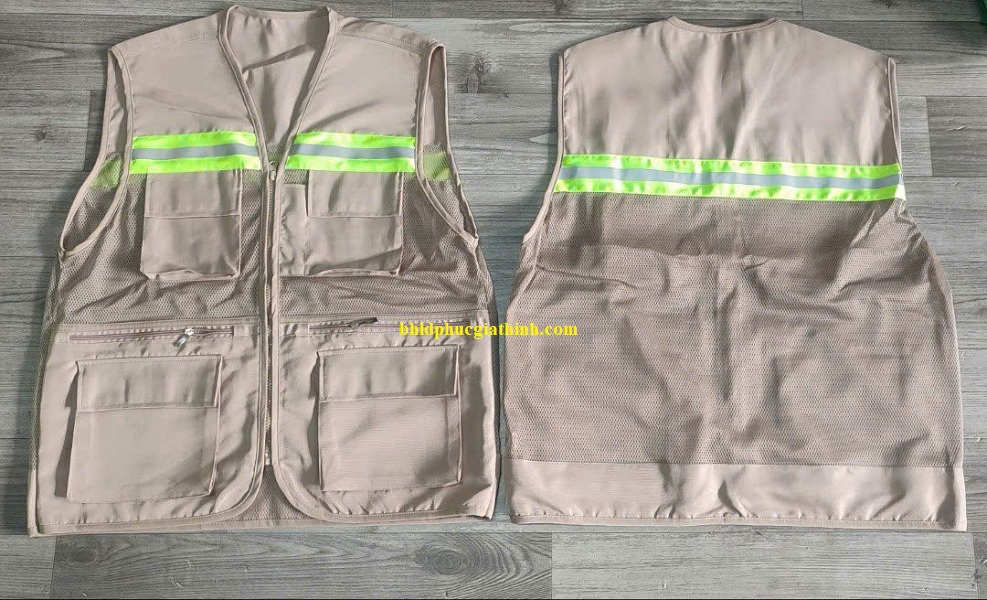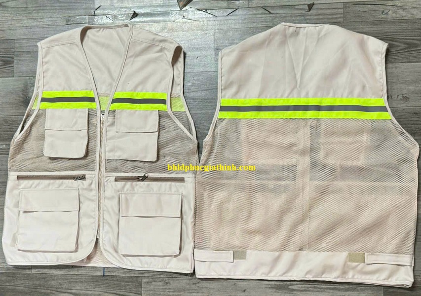 - Áo bảo hộ Ghi lê phản quang 6 túi 3 dây kéo được làm từ vải kaki 65/35 kết hợp với vải lưới thoáng mát và mềm mại