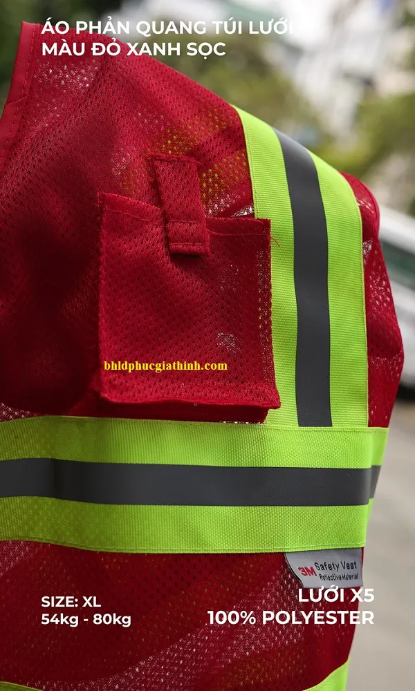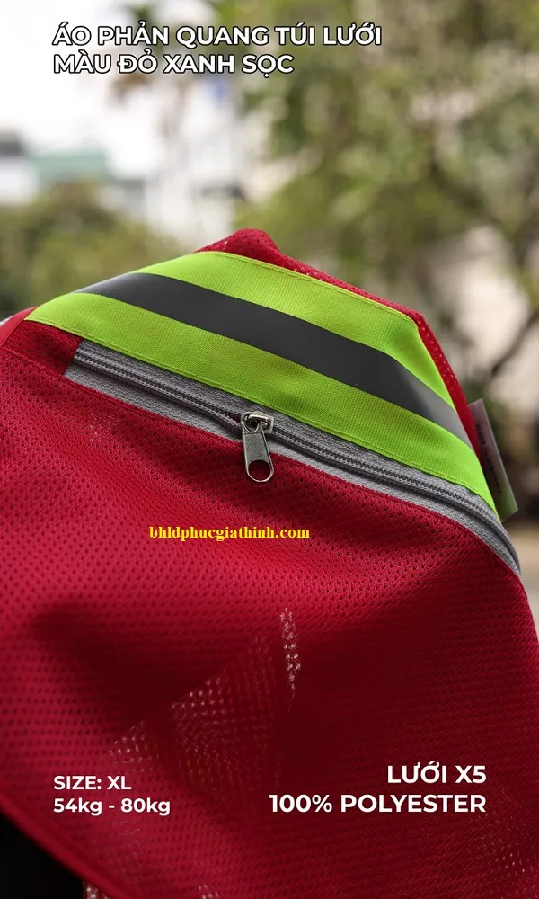 - Áo lưới màu đỏ phản quang khoá kéo 2 túi lưới có phản quang xanh sọc được may tỉ mỉ sọc bụng phía trước, 2 cầu vai, 2 sọc lưng và 2 sọc bụnghả năng phản quang hiệu quả, giúp người mặc dễ dàng được nhận biết trong điều kiện thiếu sáng, đảm bảo an toàn.