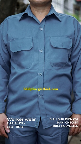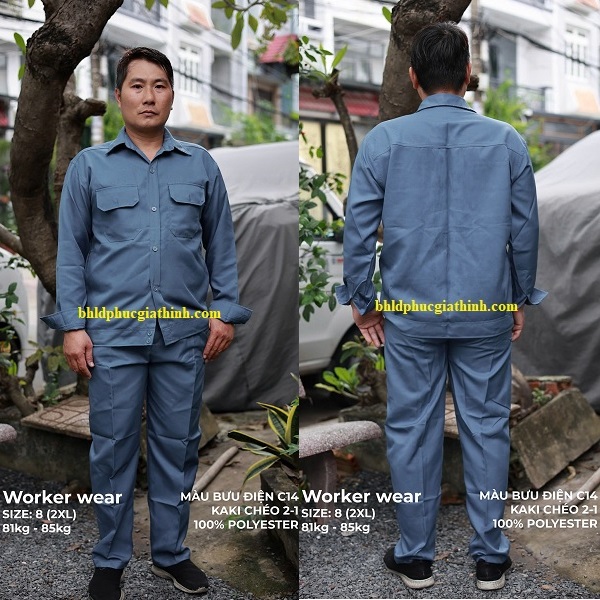 Quần áo bảo hộ màu xám bưu điện vải kaki chéo 2-1 poly cao cấp giúp bảo vệ người lao động khỏi tác động môi trường, trầy xước, dầu mỡ và bụi bẩn, đồng thời tạo hình ảnh chuyên nghiệp trong mắt khách hàng.