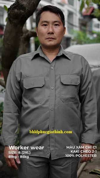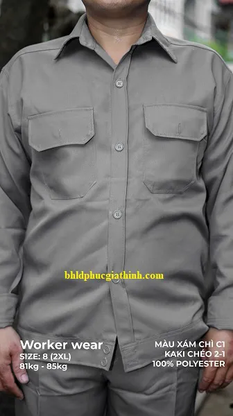 Quần áo bảo hộ màu xám chì vải kaki chéo 2-1 poly cao cấp giúp bảo vệ an toàn cho người lao động khỏi các nguy cơ trầy xước, va chạm, dầu mỡ và các yếu tố môi trường công nghiệp.