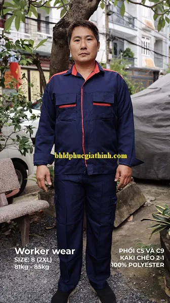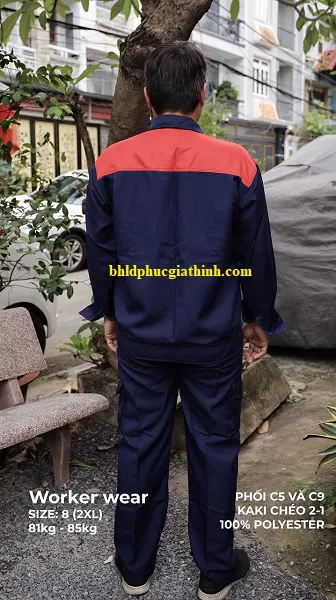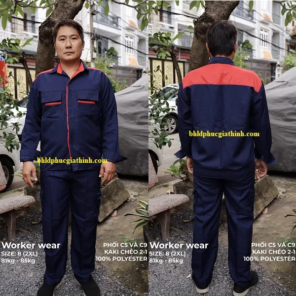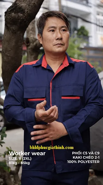 | Tên sản phẩm | Quần áo bảo hộ màu xanh đen phối đỏ vải kaki chéo 2-1 poly cao cấp |