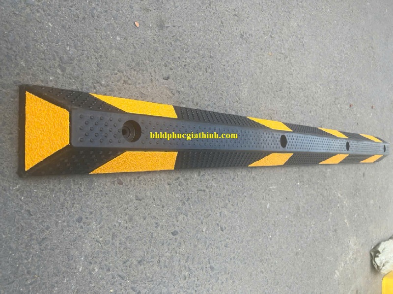 Thiết kế: Chặn bánh xe cao su vàng đen phản quang nhám có lỗ sẵn để bắt vít cố định xuống nền bê tông hoặc nhựa đường
