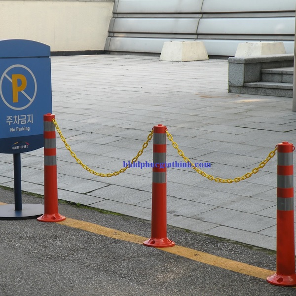 - CCọc tiêu phân làn hình trụ nhựa dẻo có đầu gắn dây xích kích thước ø200 x ø80 x H750mm thường được dùng với mục đích phân làn giao thông, cảnh báo công trình, lắp đặt phân chia khu vực tại các bãi đỗ xe, tầng hầm.