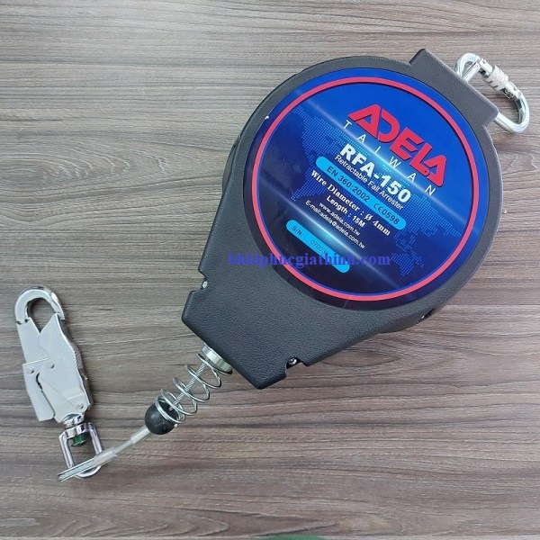 - Cuộn dây hãm tự động 15m ADELA RFA150 chính hãng có cấu tạo gồm móc treo, hộp dây, khoá nhấn liên kết ( vào khóa chữ D trên dây nịt toàn thân ), dây phụ trợ và túi đựng bằng vải