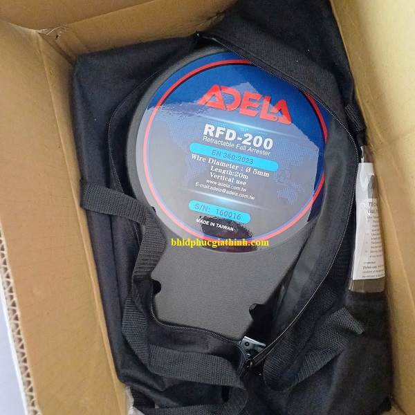 Thiết bị hãm tự động chống rơi dài 20m Adela RFD-200 dây cáp thép 5mm hoạt động giống dây an toàn trên xe hơi. Khi người dùng di chuyển bình thường, dây cáp sẽ tự động thu và nhả. Khi xảy ra sự cố rơi, hệ thống khóa tức thì giúp giảm lực tác động lên cơ thể.