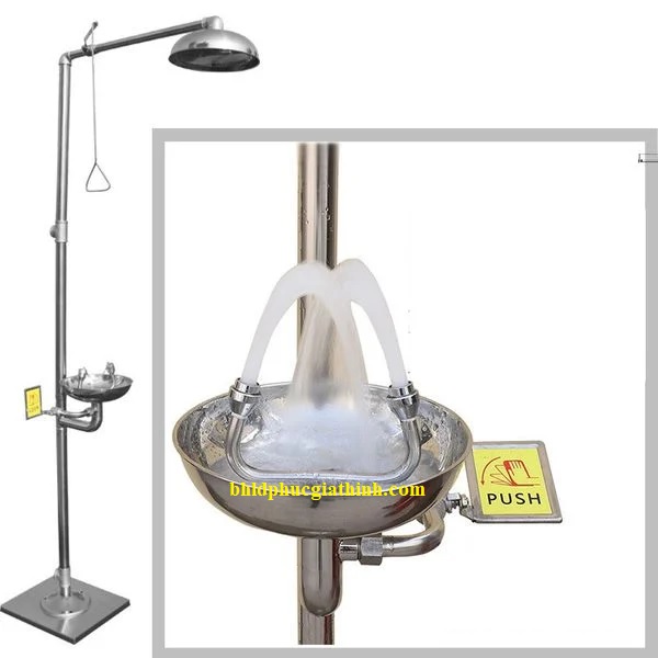 - Bồn rửa mắt khẩn cấp kết hợp vòi sen tắm khẩn cấp có chân đạp bằng Inox 304 không rỉ là thiết bị bảo hộ được sử dụng để ứng cứu khẩn cấp các trường hợp bị văn bắn hoá chất lên mắt hoặc lên cơ thể