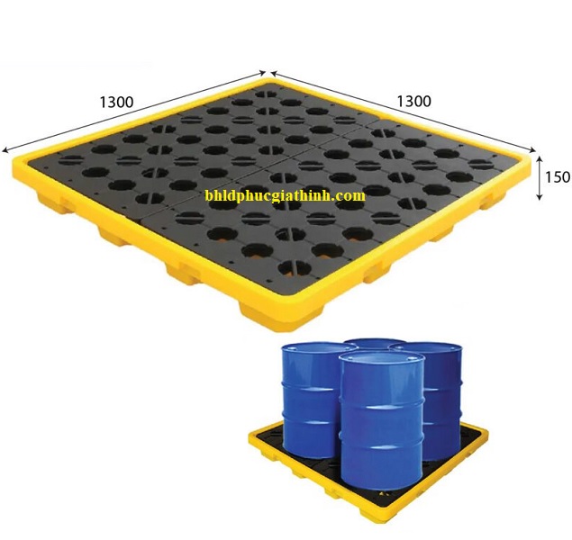 - Pallet nhựa chống tràn dầu và hoá chất 4 phuy kích thước 1300x1300x150mm được làm từ nhựa HDPE nguyên sinh có khả năng chống thấm và chịu được sự ăn mòn từ các loại hóa chất.
